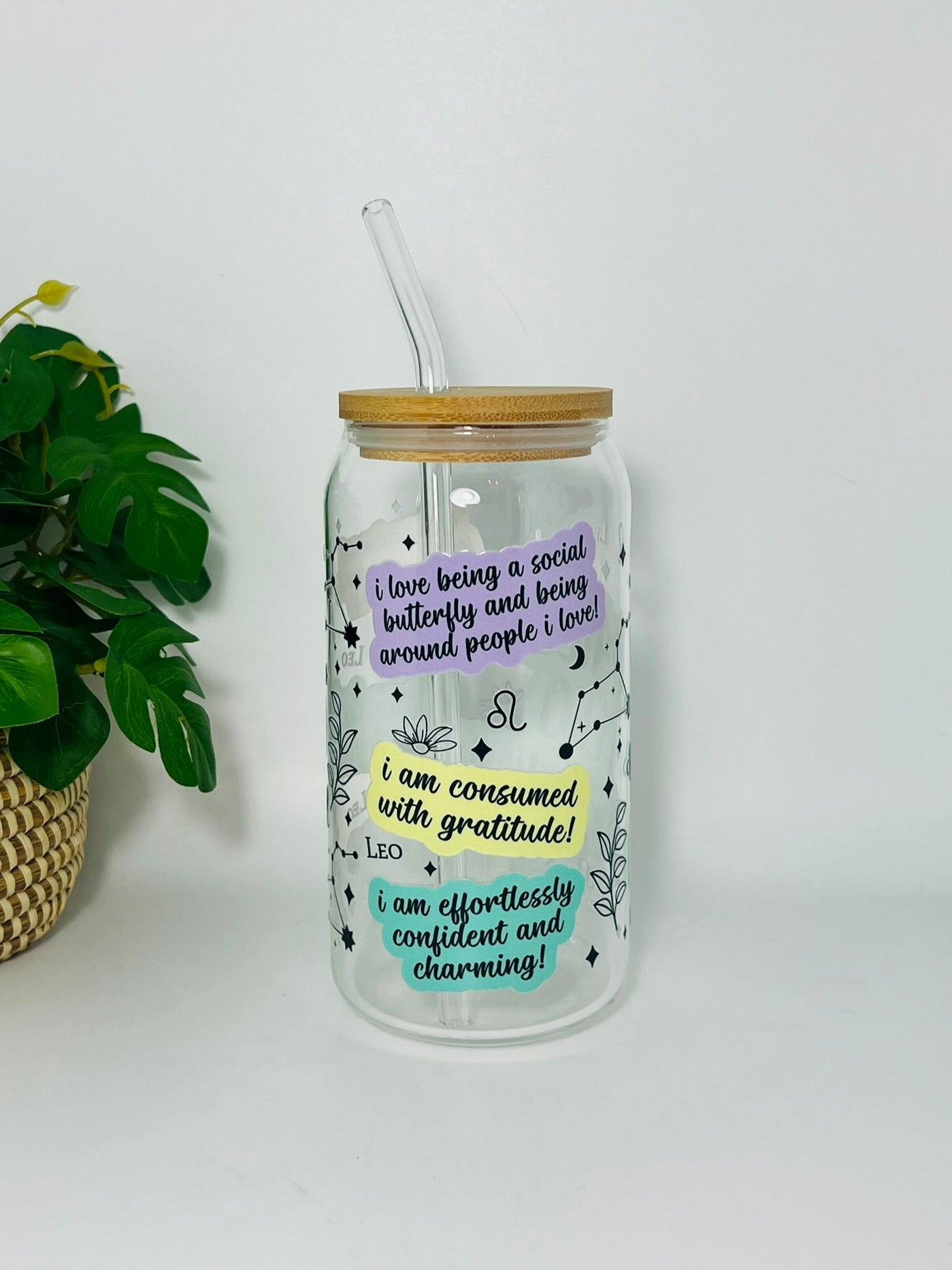 Een bamboe deksel en glazen rietje worden meegeleverd voor een stijlvolle en duurzame drinkervaring.