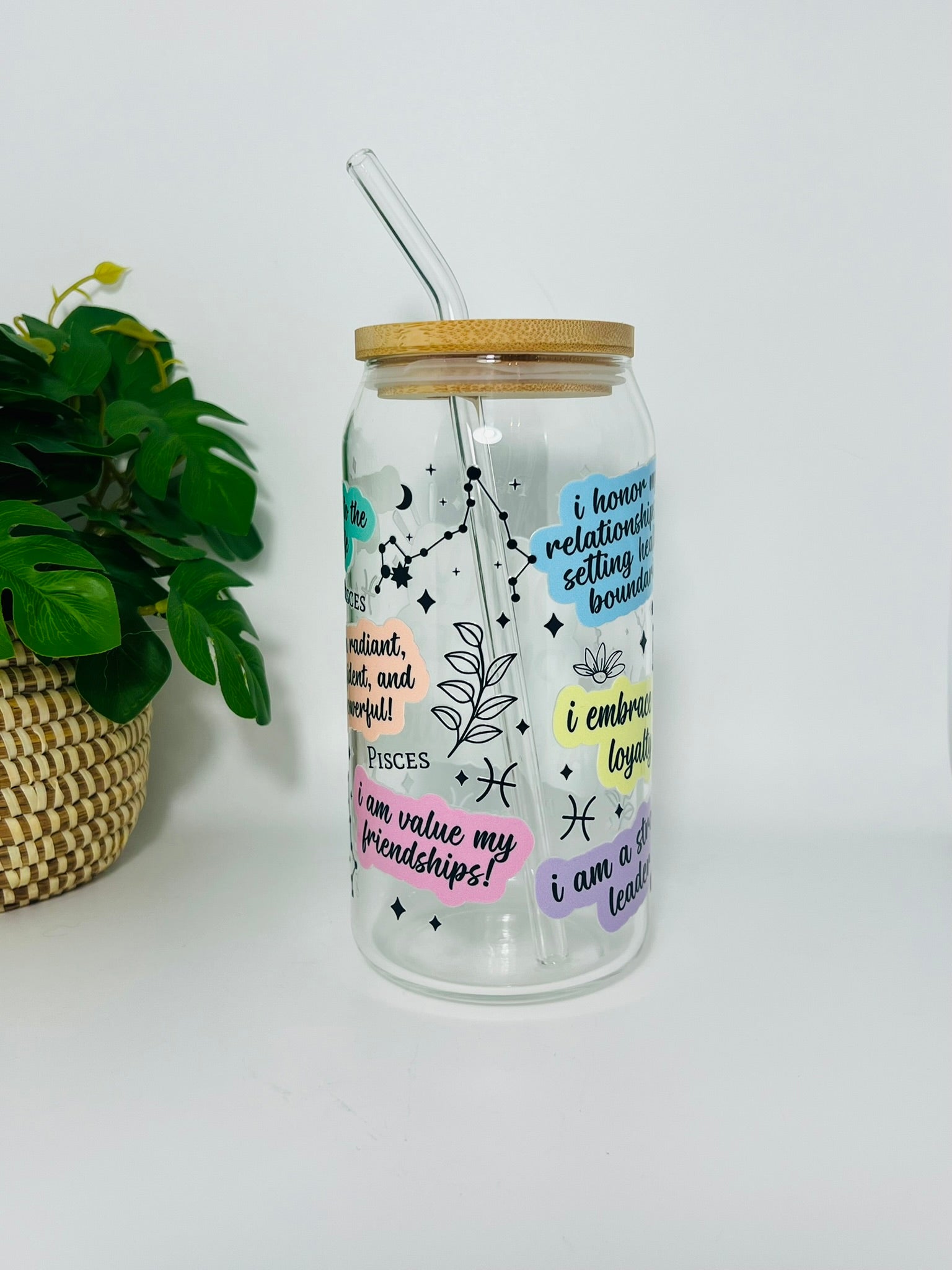 Een bamboe deksel en glazen rietje worden meegeleverd voor een stijlvolle en duurzame drinkervaring.