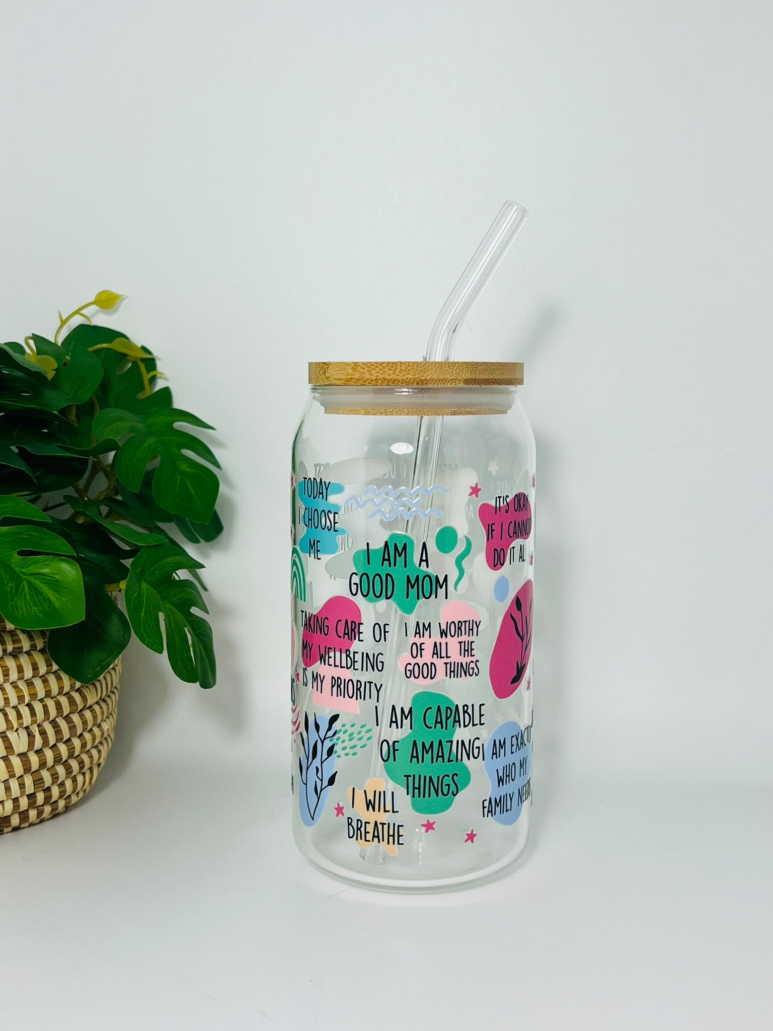 Een bamboe deksel en glazen rietje worden meegeleverd voor een stijlvolle en duurzame drinkervaring.