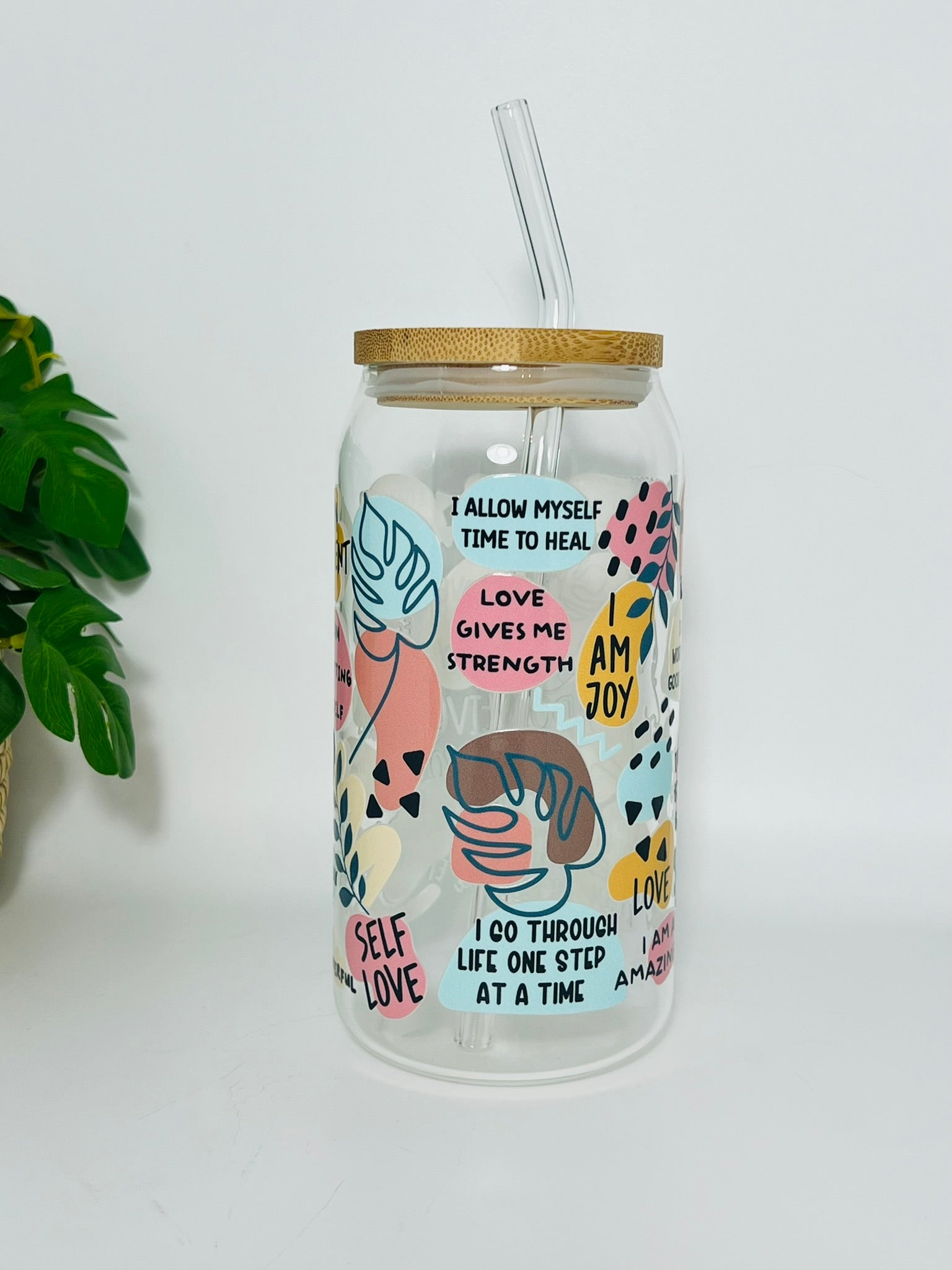 Een bamboe deksel en glazen rietje worden meegeleverd voor een stijlvolle en duurzame drinkervaring.