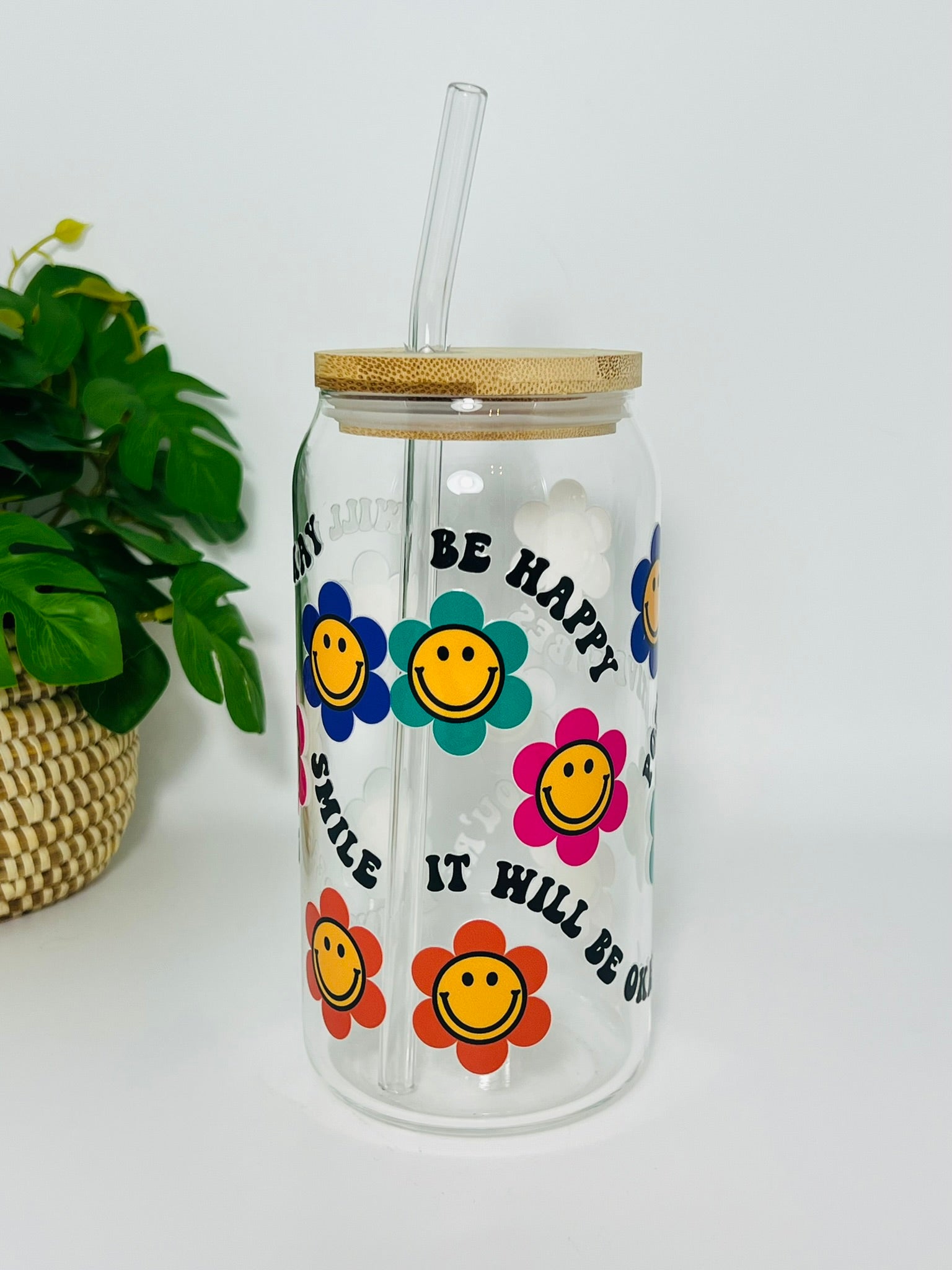Een bamboe deksel en glazen rietje worden meegeleverd voor een stijlvolle en duurzame drinkervaring.