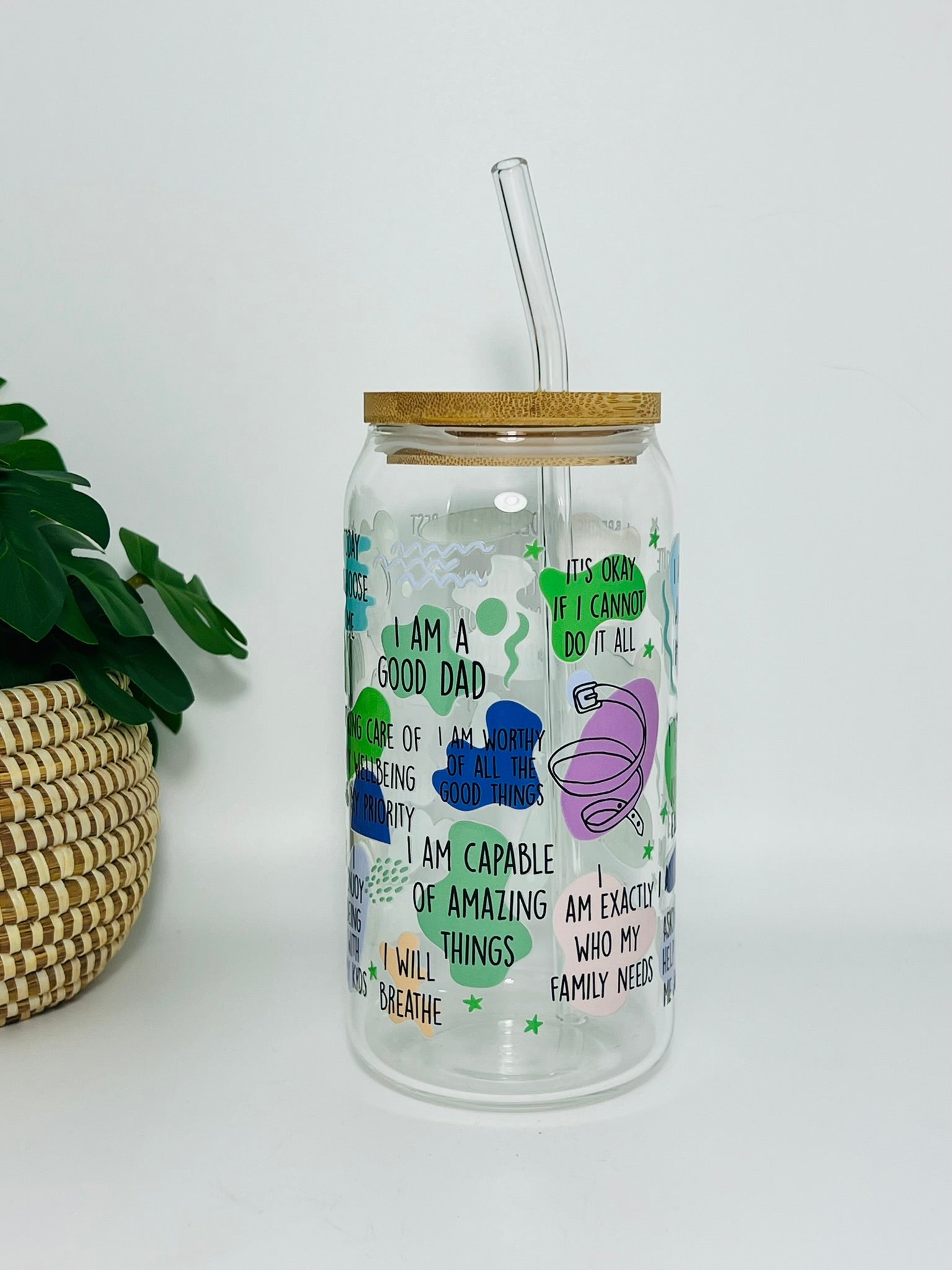 Een bamboe deksel en glazen rietje worden meegeleverd voor een stijlvolle en duurzame drinkervaring.